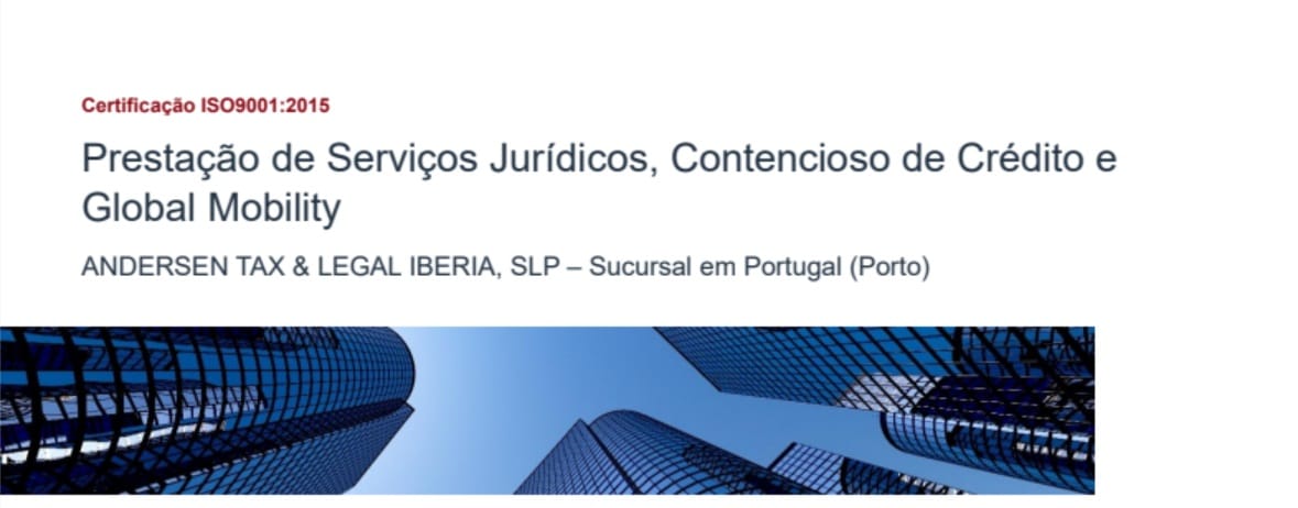 A par de outras certificações – como sendo a ISO27001 – a ANDERSEN TAX & LEGAL IBERIA, SLP – Sucursal em Portugal (escritório do Porto) passa hoje a estar certificada num âmbito de relevo, sendo das poucas firmas na Península Ibérica certificadas no âmbito da prestação de serviços jurídicos e a única certificada no âmbito da prestação de serviços jurídicos e a única certificada no âmbito de contencioso de crédito e mobilidade global.